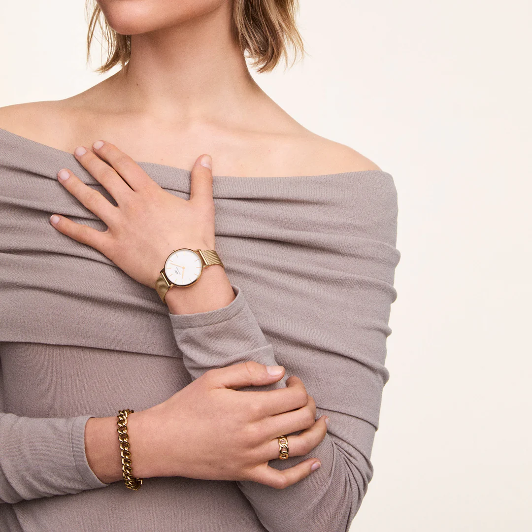 Nog steeds aan het twijfelen tussen een minimalistische en een meer verfijnde stijl? Kies voor beide met de nieuwe Quadro Evergold met een 5-link armband. Dit eenvoudige horloge heeft het minimalistische DW-ontwerp waar je van houdt, plus een vleugje luxe dankzij de vergulde verwisselbare band. De matte, eierschaalwitte wijzerplaat en de gouden armband versterken elkaar om een veelzijdig uurwerk te creëren dat opvalt bij elke gelegenheid.